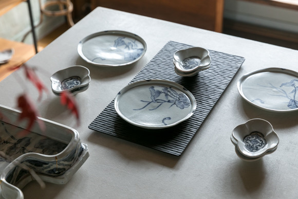 豊増:いろいろな表情が生まれるのは、薪窯で作る面白さのひとつですね。同じ窯で白瓷や染付も焼きますから、高温で焼かれた今回の白瓷は、これまでのものよりツヤがあってキンとした仕上がりに、染付の絵柄もはっきりとしたものになっていると思います。土は天草の陶石や有田の泉山陶石など、ものによって使い分けています。