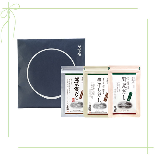 茅乃舎だし(8g×5袋入り)・煮干しだし(8g×5袋入り)・野菜だし(8g×5袋入り)のセット。3種の出汁を使ったレシピを紹介したお料理読本付き。¥1,250/茅乃舎