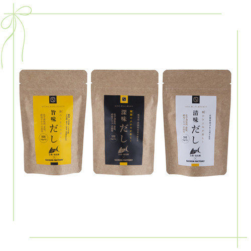 京都・福島鰹×セゾンファクトリー「旨味だし」「清味だし」 各¥540、「深味だし」 ¥594 (各5袋入り)