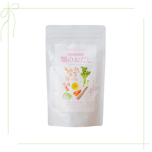 「野菜を通して、みんなが健康で幸福になる」というテーマを掲げ、2010年に誕生したHOSHIKO。熊本野菜を乾燥させ、いろいろな商品に加工するというユニークな“乾燥野菜”ブランドだ。「畑のおだし」には、甘味の強いタマネギをベースに、キャベツ、ニンジン、セロリ、トマト、ショウガ、ダイコン、ゴボウという8種類の野菜と、シイタケ、エノキの2種類のキノコ、そしておからが入っていて、熊本県産野菜のおいしさがそのまま食卓に届く。煮出して使うのがベーシックだけれど、パックを開けて、粉末を炊き込みご飯に入れたり、パスタソースに入れたりしてもいい。煮出した後のパックを切って中身を取り出し、餃子や肉団子の具材として混ぜこむのもおすすめ。無駄がないうえ、食物繊維がたっぷり摂れる優れものだ。