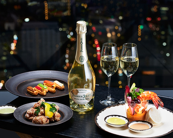 フィンガーフードから本格的な寿司まで、望むものはおおよそ何でも出てくる、フーディにとっても魅力的なこのバーで「ペリエ ジュエ ブラン・ド・ブラン」とマリアージュさせたいのは「大エビのカクテル」とホテル名物の「エクレア」。宝石箱のようなエビのカクテルはジューシーで、ひと口サイズのカラフルなエクレアはクリーミー。それぞれの味わいが「ペリエ ジュエ ブラン・ド・ブラン」の生き生きとした酸味を引き立てる。並べた姿もフォトジェニック。ブラン・ド・ブランならではの透明感が引き立ち、泡の輝きが夜景の光の粒とシンクロする。「ペリエ ジュエ ブラン・ド・ブラン」は、特別な夜には欠かせないシャンパーニュだ。