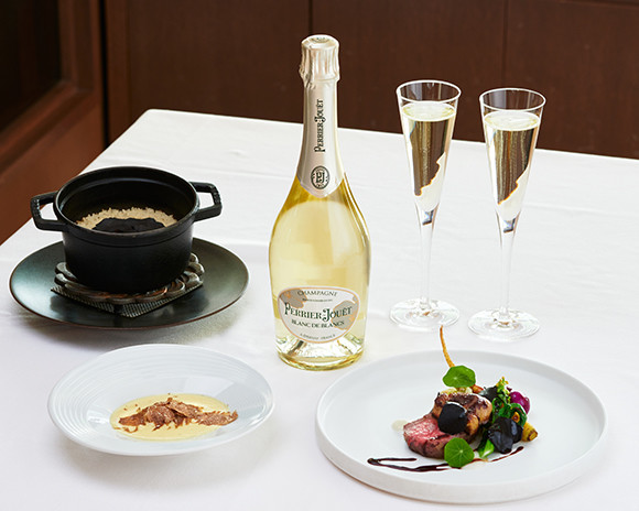 料理はすべてディナーコース(¥18,150)から。手前左が、ニースでも人気の「ジャガイモのロースト トリュフクリームソース」。トリュフ と「ペリエ ジュエ ブラン・ド・ブラン」に共通した熟成感を楽しみたい。ランチコース(¥6,050)でもいただける。手前右はメインディッシュの「ロッシーニ」。和牛フィレステーキとフォアグラソテーを贅沢に味わえる。奥はダッチオーブンで炊き上げた「黒トリュフの炊き込みご飯」。「ペリエ ジュエ ブラン・ド・ブラン」1グラス ¥3,380