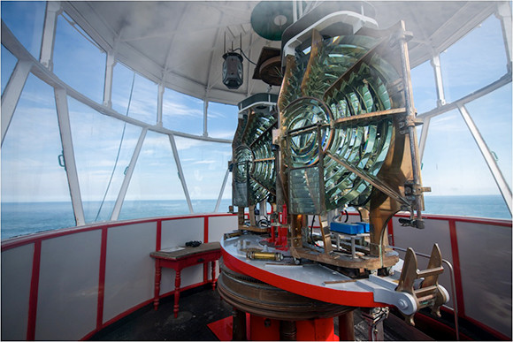 最上部。灯台に特徴的なフレネルレンズは、19世紀にフランス人の物理学者フレネルが開発したものだそうです。なんかかっこいい(小学生)。