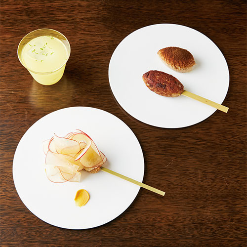 店名どおりテーマは串。フロリレージュの川手寛康シェフはこう語る。「傳の長谷川在佑シェフと一緒にやるのなら、料理はやはりグローバルにしたい。その点、串料理は世界各国にあるでしょう。ここでは、串の可能性を追求していきたいですね」。それゆえ、コースの料理はすべて串に刺した形で登場。ブーダンノワールに薄くスライスしたリンゴのガリ、イワシのつみれとレバームースなど、和と仏の要素が巧みに融合する、ひと皿ひと皿が魅力だ。