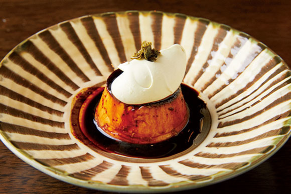 煎茶のクリームをのせたプリン。