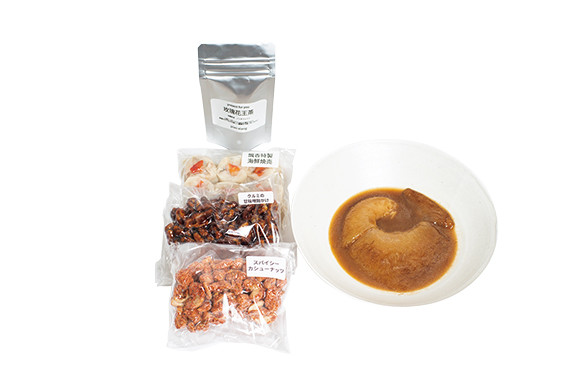 堂々150gのフカヒレ姿煮が入ったスペシャルBOXは、四川料理の名店の飄香謹製。肉厚な毛鹿鮫のフカヒレにザクリと歯が入る醍醐味は格別だ。濃厚なソースが染み込んだ旨さはレストランそのまま。ほかに三鮮焼売とクルミ甘味噌餡がけ、スパイシーカシューナッツが入る。¥8,000
