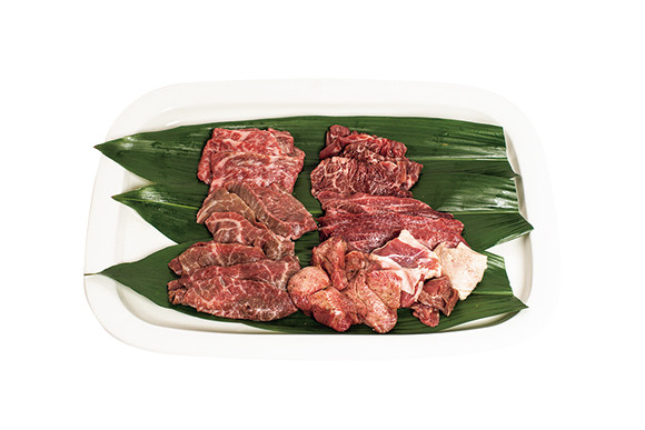2年先まで予約が取れない人気店、焼肉ヒロミヤ。お取り寄せのセットには、店のコース同様、名物の上タンから特選リブロース、特選ハラミ・サガリや和牛ランプ、牛頰肉が各100gに牛ハツモトなど、8種の肉が計600g入っている。2人前 ¥10,800