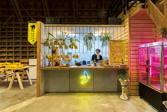 ピンクのネオンがまぶしい、かんたん港の目の前にあるバナナスムージー専門のジューススタンド。ストレージルームというライフスタイルショップの奥がスタンドになっており、青果市場で働いていた目利きのオーナーが市場のバナナを厳選、さらに2、3日かけて追熟させて超濃厚な一杯を作ってくれる。1日に200杯は出るという人気のスムージー、早い時間帯にお求めを。