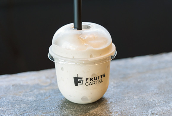 3本分のバナナを使ったフレッシュなバナナスムージー(小)¥500。ベースは牛乳か豆乳を選べる。黒ゴマきなこと抹茶フレーバーのカスタマイズも可能。