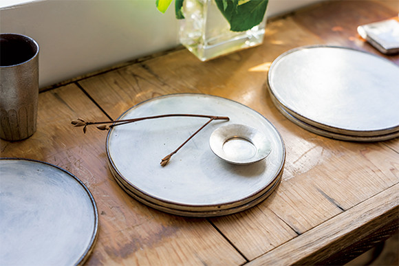 千葉から国東に移住し、田畑を耕しながら作陶に励む「くにさきかたち工房」垣野勝司のうつわ。独特の風合いが食卓に味わいを添えてくれる。平皿¥2,640、豆皿¥1,540。