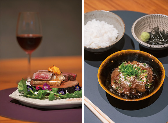 左:30代の若手シェフが腕を振るう料理の数々。この日のメインは長芋といただく大分和牛のランプ肉。右:食事の締めは、大分の郷土料理、魚を醤油に漬け込んだ「りゅうきゅう」を、ツヤツヤの白米と一緒にいただく。