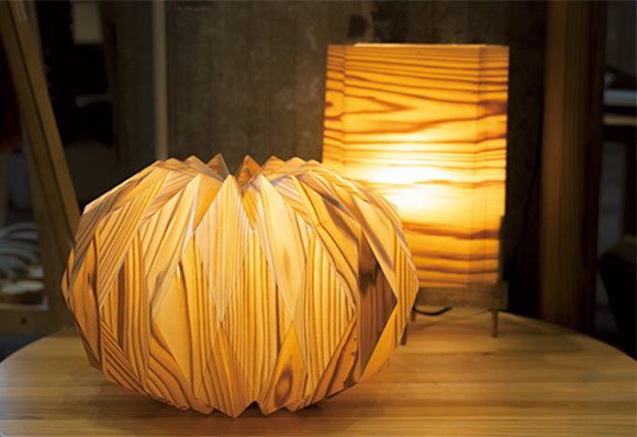 下:日田杉を薄くスライスした、中川千年デザイン室のフロアランプ(手前)¥14,666、(奥)¥9,166 下奥: