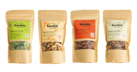 4種のフレーバー展開。クリスピー&スパイシーなケイジャンスパイスは赤ワイン、辛味とナッツの甘さのコンビネーションが楽しいトムヤムクンは白ワインに合わせたい。左から、抹茶グリーンティー、トムヤムクン、ケイジャンスパイス、オリジナルスモーク。抹茶のみ90g 、ほか各100g 各¥730