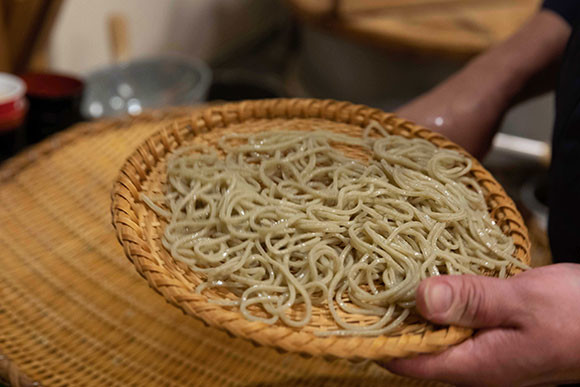しかも、すべて手挽きのうえ、石の材質が異なる4つの石臼で挽き分ける凝りようだ。が、そこは江戸蕎麦のツルッとなめらかな喉越しをよしとする矢守さんのこと。小麦粉の代わりに、石臼で挽いた微粉の蕎麦粉を加え、喉越し軽やかな蕎麦に打ち上げている。