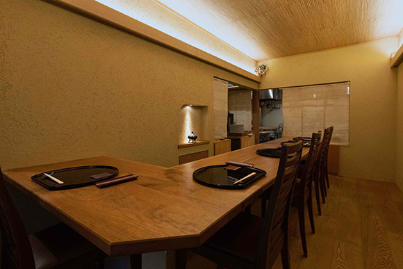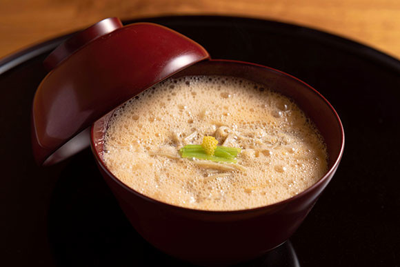 料理はお任せの蕎麦懐石のみ。コースの中には、この蒸し蕎麦のほか、写真の淡雪蕎麦や鴨南蛮、しっぽく、花巻など江戸の頃から続く種蕎麦も季節に応じて登場。締めのせいろ蕎麦のおいしさは言わずもがな、客の目の前で挽く挽きたての蕎麦粉で作る蕎麦がきの旨さも特筆ものだ。