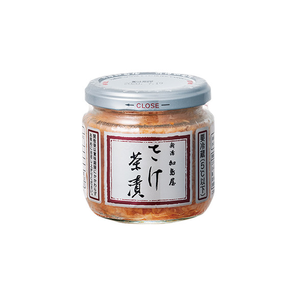 1855年、信濃川や阿賀野川で取れた魚の塩干物で創業。脂の乗ったキングサーモンに塩をすり込み、丁寧に熟成させて旨味を引き出した焼き鮭のほぐし身。ご飯やおにぎり、玉子焼きの具材に最適。中ビン 140g ¥1,944