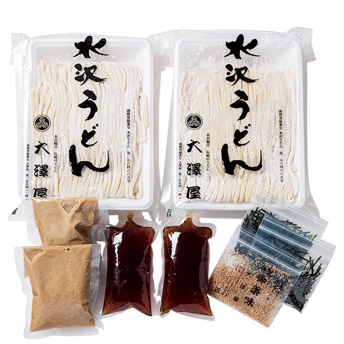 伊香保温泉近くに店を構える大澤屋。小麦粉、塩、水沢の水で打った名物の水沢うどんは、生麺ならではのもっちりとした食感で喉ごしも格別。特製つゆとゴマ汁付き。4人前 ¥2,365