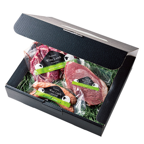 山梨県産のワイン粕で飼育された、ふじさんワインラム。ステーキカット、粗挽きジャンボソーセージ、スライスハムの詰め合わせはギフトにも最適。臭みがなく、ジューシーな味わいを堪能して。¥4,400