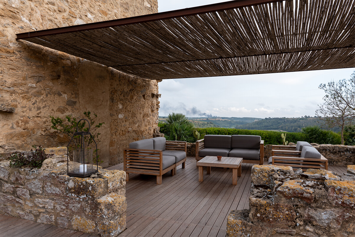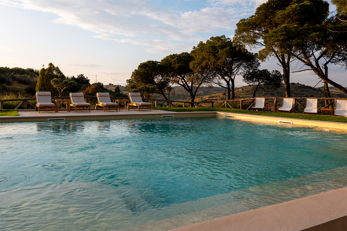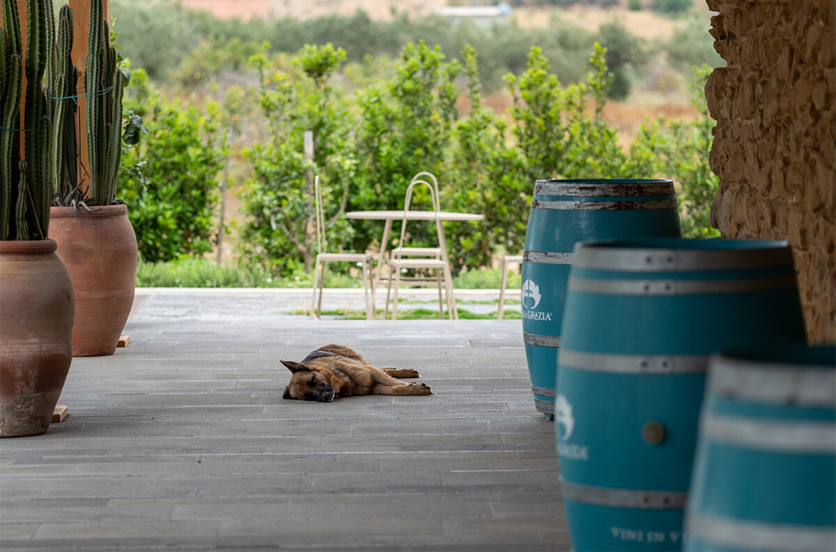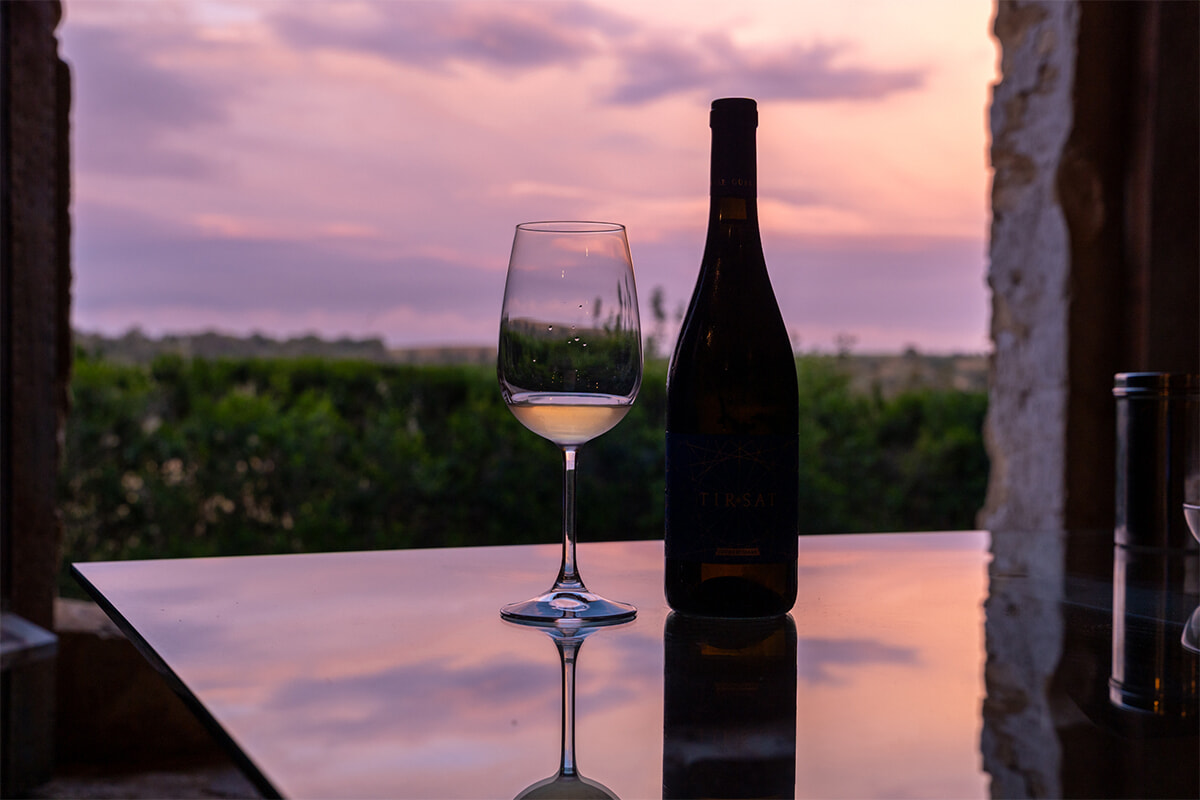 プールの水面が夕暮れ色に染まる頃、羊の群れを乗り越えて到着しました。最後にご紹介するのは、ワイナリー兼ホテルでもあるFeudi del Pisciotto。