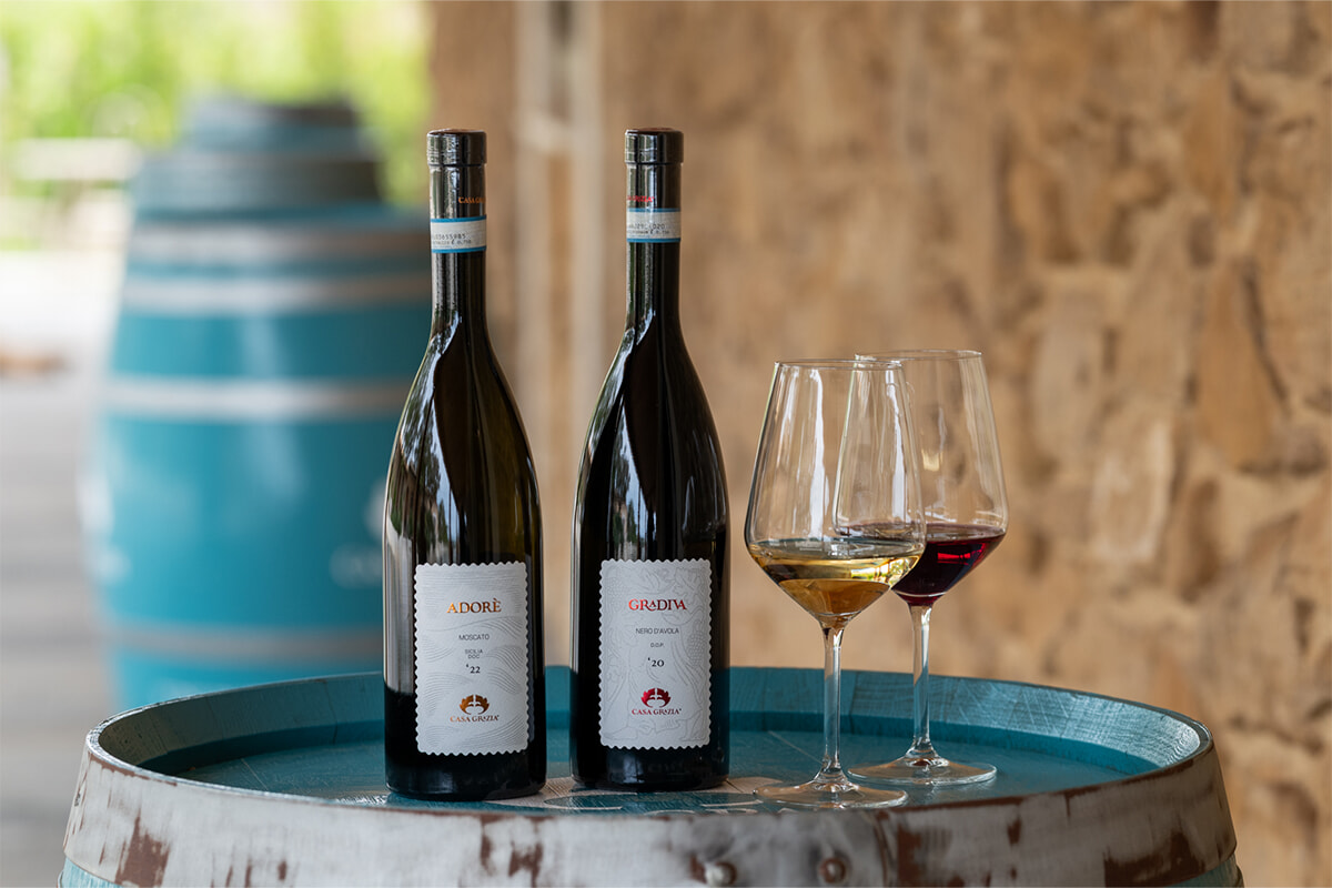 バレンティノなど、さまざまな有名デザイナーとコラボしたラベルでも知られるFeudi del Pisciotto。写真のチェラスオーロ・ディ・ヴィットリアとフラッパートには、どちらも軽く樽が効かせてあり味わいのスパイスになっています。