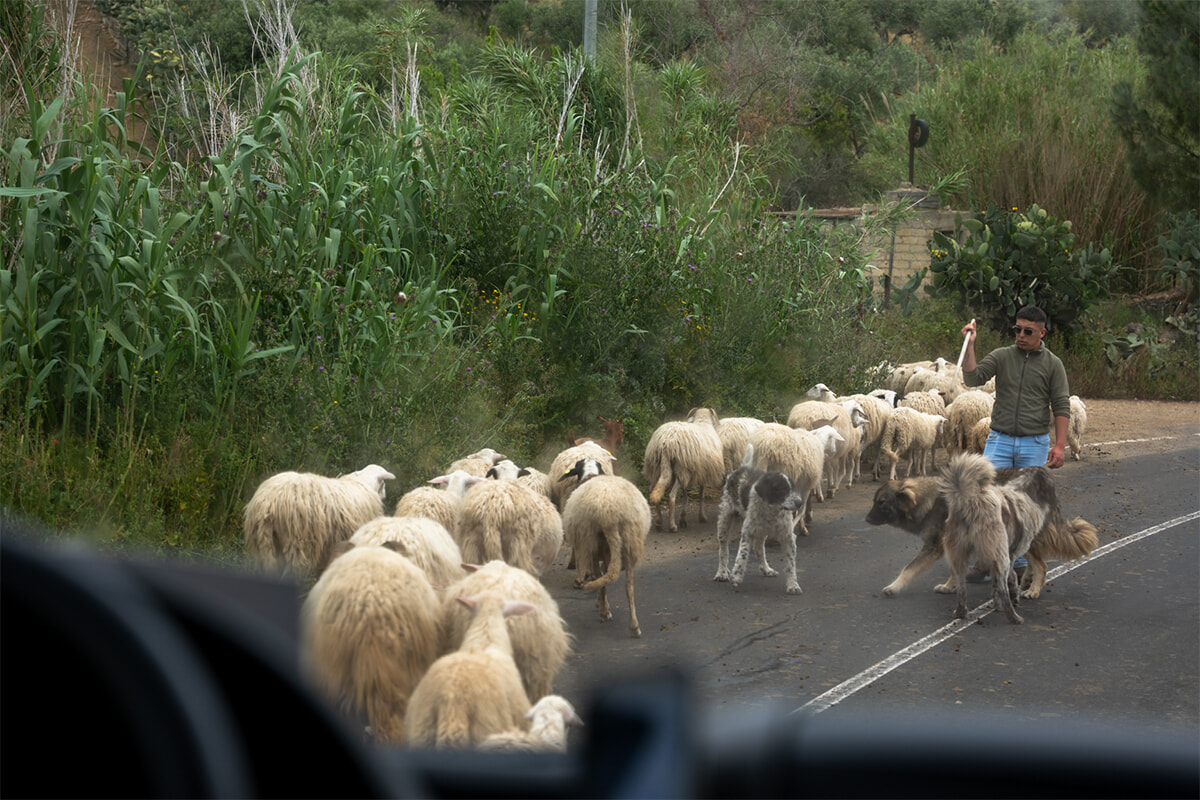 さて、次のワイナリーに移動する道すがら、羊の群れに遭遇。シチリアあるあるな一場面。