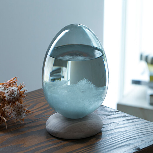 毎朝、デスクに向かう前にひと目見る。このストームグラスは、その日の気温や気圧の変化に反応して、ガラスの中の結晶が姿を変える。卵形のガラスの中で起きているのは、天気予報ほど正確な情報ではないけれど、「今日は空気が軽い」「少し冷えそうだ」そんな感覚を、視覚的に教えてくれる。