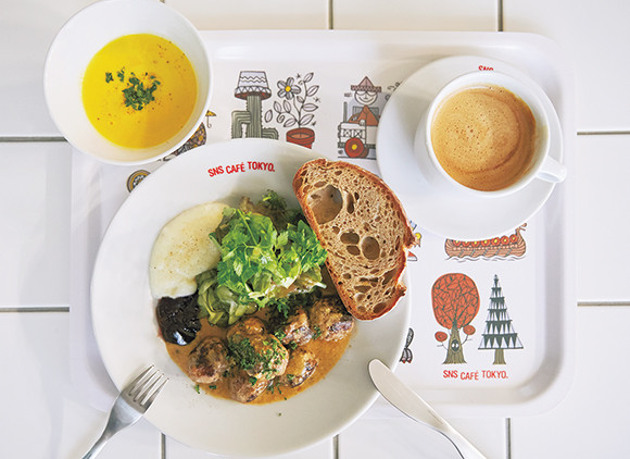 SNSが店舗を展開する、世界の各都市から着想を得た「SNSシティプレート」¥1,540 、ホットラテ¥660 。写真はストックホルムのミートボール。ニューヨークのハンバーガーやロサンゼルスのヴィーガンタコスなども用意。メニューは週ごとに替わる。