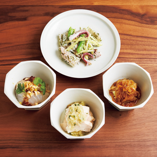手前は「おまかせ前菜3種」¥1,848。左から、「鮮魚のお刺し身サラダ」(写真はスジアラ)、「蒸し鶏のネギソース」「クラゲの冷菜」。奥は「白イカの青ジソ炒め」¥2,068。白イカとスナップエンドウ、黄ニラをさっと塩味で炒めた一品。