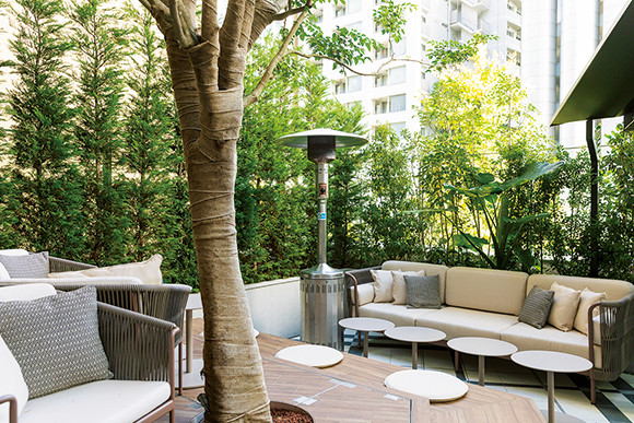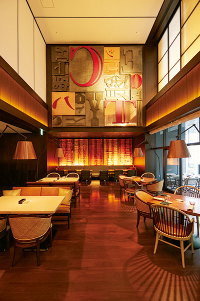 かつて朝日新聞社があった場所に建てられたというエピソードになぞらえ、活版文字をモチーフにした遊び心あふれるアートワークが随所に。天井が高く、開放的な雰囲気。テラス席の下には並木通りを望む。