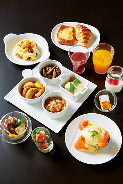 宿泊者限定の「アトリウム ブレックファストビュッフェ」¥4500 フレンチ、イタリアンなどさまざまな技法を凝らした洋食コーナーより。奥左の「フレンチトースト グラチネ」も人気。
