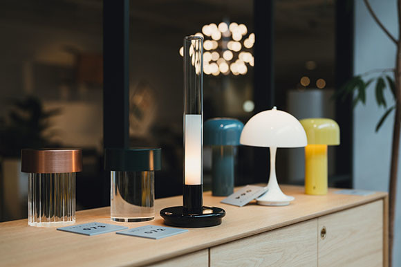 おうち時間が増えたいま、テラス、ダイニング、バスルームなど、室内のさまざまな場所に移動できるコンパクトで優美なコードレスポータブルランプが人気。どれも調光機能がついているので、場所や時間に合わせて明度を調整できるのが魅力。左から:古代ギリシャの建築様式を印象したガラスのベースを通して光を拡散する「ラスト オーダー」¥64,900~、上品なオイルラインを思わせるデザインの「シルベストリア」¥75,900、2012年のロンドン五輪のトーチも手がけたバーバー&オズガビー作の「ベル ホップ」¥39,380、ミッドセンチュリーのデンマークデザインの中で異彩を放ったヴァーナー・パントンの代表作ランプを2020年にポータブルに再解釈した「パンテラ ポータブル」¥28,600
