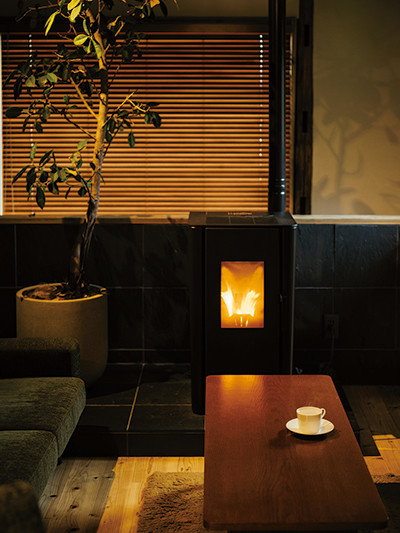日が落ちた後は照明を抑え、1階リビングのぺレットストーブのスイッチをオン。談笑する時間すら、特別なものに。