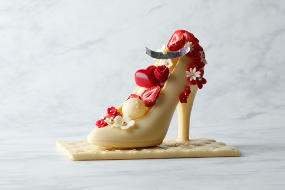 ハイヒール型のショコラ「ショスュール 2021」は、昨年に続き2021年限定版が登場。金箔のアラザンや色鮮やかな花々をあしらったエレガントなハイヒール(高さ13cm!)を模し、中には、フリーズドライのフランボワーズや苺、ホワイトチョコレートのトリュフを詰め込んでいる。真っ赤なハートのボンボンショコラは、シャンパーニュ風味で上品な甘さに仕上げている。