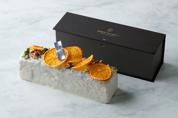 グレープフルーツやオレンジなど柑橘系果実を使用したパウンドケーキ。生地はグレープフルーツピール入りで、トッピングのピスタチオやクルミ、ドライオレンジと相まって、さまざまな食感を楽しめる。爽やかな果実の酸味とケーキの程よい甘さのバランスを堪能して。「ケーク オゥ ダグリューム」¥4,970(限定50個)