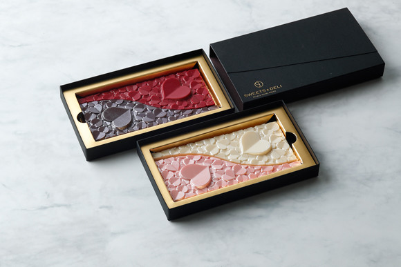 ハートのモチーフが可愛らしいタブレット型ショコラ。ストロベリーミルクとホワイトチョコレートの「ブラン」、ダークチョコレートとフランボワーズの「ノワール」、どちらの組み合わせがお好み? 「タブレットクール(ブラン/ノワール)」各¥1,620 *オンラインショップでの購入も可。