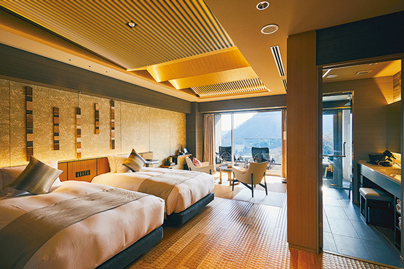 2020年10月、相模湾まで見渡せる高台に誕生した宿は、その眺望を生かして設計され、どこにいても緑や水を感じられる気持ちよさ。客室のバルコニーには露天風呂が付き、2つの展望露天風呂、3つの貸切風呂と、温泉だけでもさまざまに楽しめるが、和食と鉄板焼きの2つのレストラン、宿泊者専用のラウンジやスパも設けられ、贅沢な滞在が叶う。スパオリジナルのアメニティにダイソンのドライヤー、ナノスチーマーまで備えているから、温泉の効果と合わせてキレイになって帰りたい。