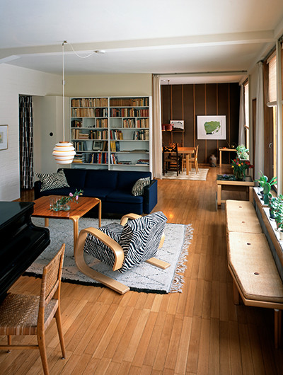 フィンランドの首都、ヘルシンキ郊外の閑静な住宅街にあるアアルトの自邸。1936年から40年間にわたり住み続けた邸宅のリビングルームには、中庭から柔らかな光が注ぎ込む。素朴で心地の良い時間が流れるなかで、人々に提案する豊かな暮らしを自ら実践していた様子が伺える。©Alvar Aalto Foundation