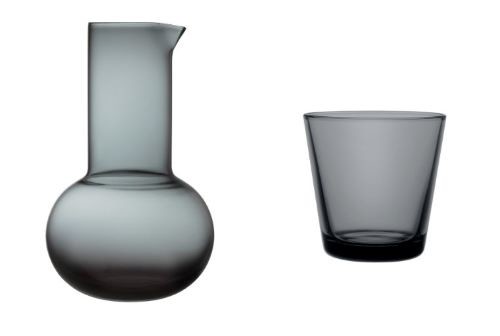 写真左:カラフェはオンラインショップと表参道ショップ限定。「カルティオ カラフェ 1600ml (ダークグレー)」¥13,200(3月17日発売予定)、右:「カルティオ タンブラー 210ml ペア(ダークグレー)」(φ8×H8cm)¥2,640 / ともにイッタラ(イッタラ 公式オンラインショップ)