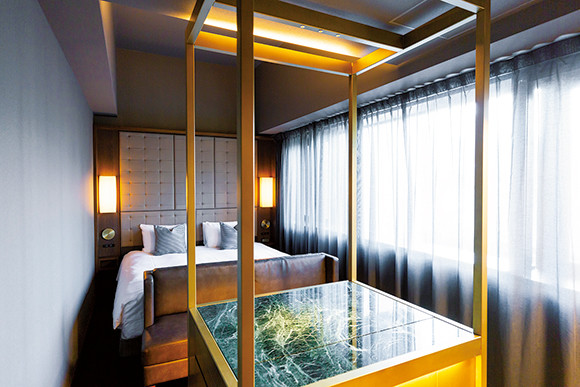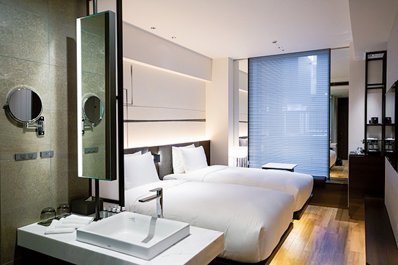 銀座の街に溶け込む、エレガントな佇まい。チェックインすると、手書きのメッセージを渡され、ウェルカムドリンクの代わりにワゴンからパート・ド・フリュイを選ぶのもヨーロッパ流。客室はゲストの使い勝手がいいように直線的にデザインされていて、夜は安眠用にラベンダーの香り袋を自分で作れるターンダウンサービスも。実はルーフトップにもソファが置かれており、天気がいい日はここで過ごすのも格別だ。
