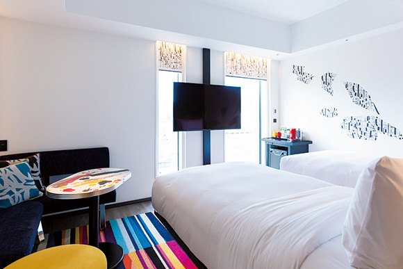 東銀座に向いたサヴィーツイン。カラフルなテーブル、壁やスクリーンロールのグラフィックもアート作品。