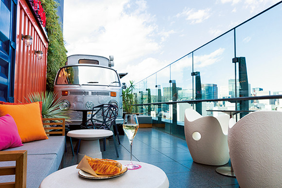 吹き抜けのロビーを抜けると、多様なジャンルのグラフィックアートが飾られ、遊び心にあふれるラウンジが広がる。ここでも、機能的な客室でも、いずれも仕事がしやすい。また、麻布十番商店街沿いに立つから、お腹が空けば歩いて名店に行くことだってできる。最上階には、バーとは別のエリアに5人まで泊まれるテラス付きのライブリーロフトが2室ある。2段ベッドがおしゃれに配置されているから、グループで泊まって、夜ふかしを楽しむのに最高の場所だ。