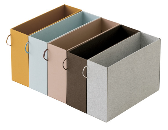強化加工した段ボール製の書類ボックスは紙紐の取手付きで使い勝手がよく、豊富な色数も魅 力。一色でも複数色でもインテリアに自然と調和し、縦横どちらで使ってもOK 。大成紙器製作 所のファイルボックス(H24×W10.5×D34.5cm)各¥880/TAISEI