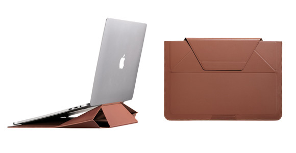 ノートPCを収納&保護するだけでなく、ワンタッチでPCスタンドに早変わりするモフトのケース。優れた耐久性と撥水性、そして上質な質感を備えた特注のフェイクレザーを使用している。PCケース(H34×W24×D0.7cm)¥5,980/チャムジャパン