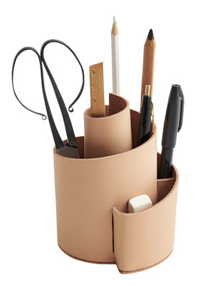 ヌメ革を丸めて仕上げたペンスタンド。螺旋の構造により生まれる仕切りの高低差を利用して、文具に合わせて収納スペースを仕分けることが可能に。ペンスタンド(H13×W10× D10.5cm)¥9,900/イロセ