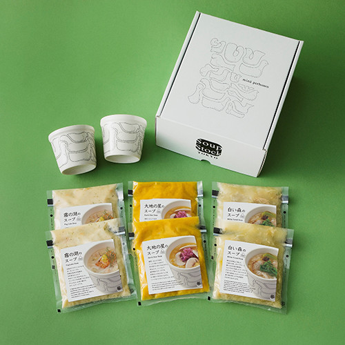スープの名前は皆川明が考案し、納得のいくおいしさを完成させるために何度も試食を重ねた。「スープストックトーキョー × ミナ ペルホネン」冷凍スープセット(「霧の湖のスープ」「大地の星のスープ」「白い森のスープ」の3種×2袋、スープカップ2個、オリジナルデザインボックス付き)¥10,500