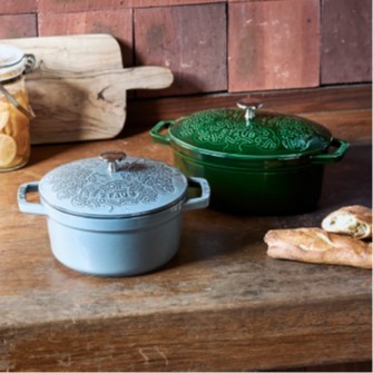 奥:鍋「ストウブ × ミナ ペルホネン フォレストココット オーバル バジルグリーン」(Φ23cm)¥35,200 手前:鍋「ストウブ × ミナ ペルホネン フォレストココット ラウンド グレー」(Φ20cm)¥34,100(ともに三越伊勢丹先行発売)