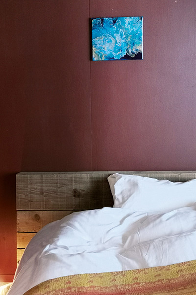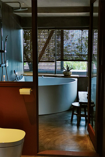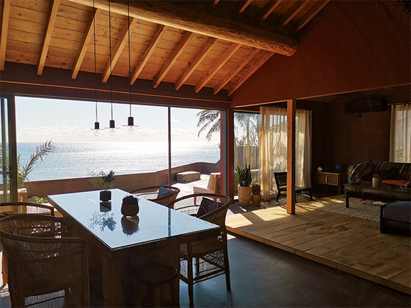 2020年3月にオープンしたビーチフロントの宿は、リビングルームから海を一望できる贅沢な空間。海の青とコントラストを効かせるように塗った、赤紫の壁がこだわりだ。オーナーがアフリカや南米で買い付けてきたインテリアやテキスタイルのファブリックもセンスよく配され、クリエイターたちの間で話題に。テラスのチェアに横たわって、朝昼夜で変わりゆく海の表情と光と影の陰影を楽しんで。