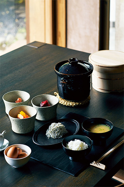 地産地消にこだわった朝食。葉山の地鶏卵や鎌倉の釜揚げシラス、鎌倉野菜の漬け物を炊きたてごはんとともに。