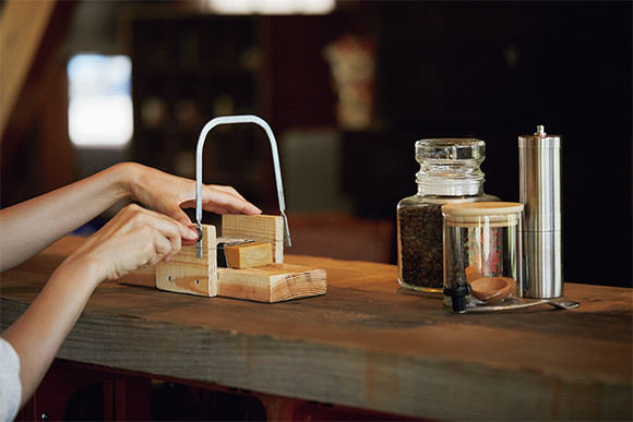 チェックイン時に、無添加石けんを必要な分だけ切り分ける。