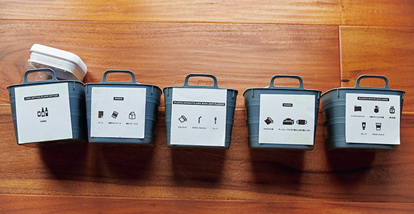 宿泊客には、まず6つの小さなゴミ箱を渡す。分別ラベルに従い、滞在中はここにゴミを捨てていく。